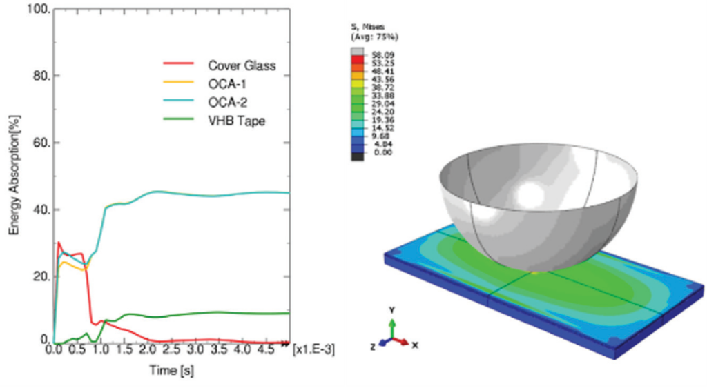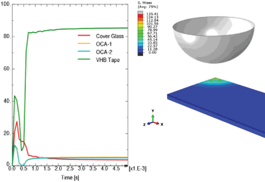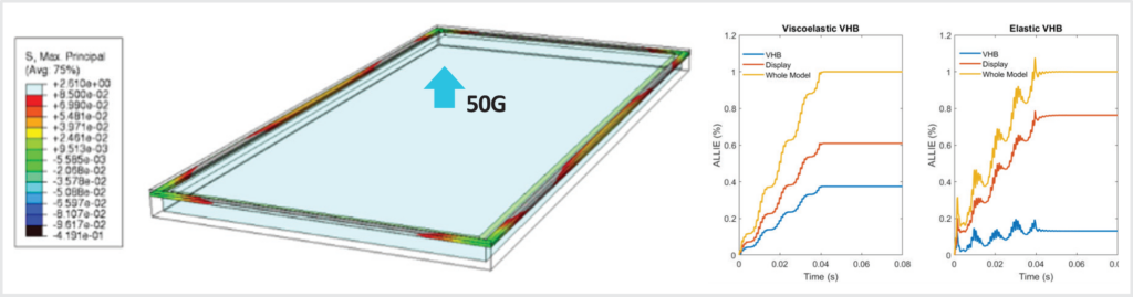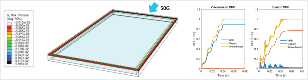 This type of test is typically done experimentally. For this study a computational finite element model of the 3M proprietary display with the main components was evaluated including the different layers beneath the cover glass. A hyper-viscoelastic material model was used to model the VHB Tape and OCA (Optical Clear Adhesives).