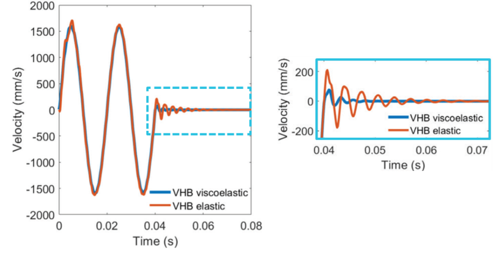 These figures demonstrate the viscoelasticity of 3M VHB Tape and how it provides necessary energy absorption during impact events. Figure 7 illustrates an impact-type velocity oscillation. Figure 7a details the damping difference between viscoelastic and elastic behavior. By applying oscillatory excitation, a post-pulse oscillation takes longer to absorb the oscillation on the elastic than on the viscoelastic model. For the elastic model a hyperfoam elastic model has been used.