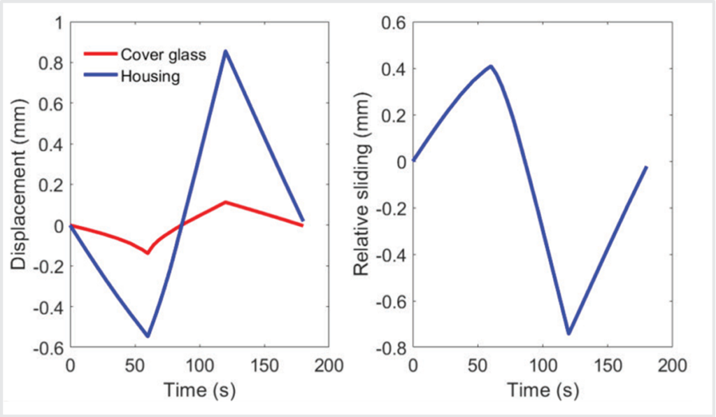 In Figure 10 the displacement of housing (magnesium) and cover glass are shown (based on an 800 mm length display). The left side shows absolute displacement of each substrate, and the right side shows relative displacement from each other. Figure 11 shows the resulting stress on each element.
