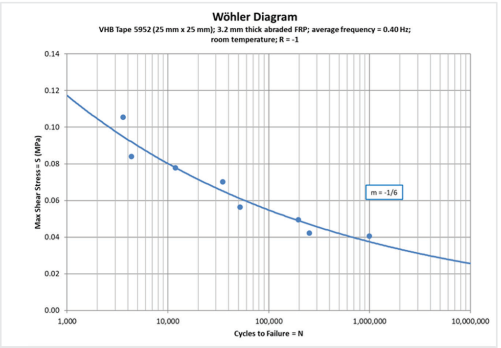Stress loading conditions can be chosen based on a specific application where cyclic fatigue loading will stress a tape during its service life. An example is provided below showing an SN curve for 3M VHB Tape 5952 which shows the relationship between stress amplitude and cycles to failure at a controlled frequency of 0.4 Hz. A similar curve can be created for application specific frequencies and stress loading to gain insight into the suitability of an adhesive for an application where dynamic loading is present. Figure 12 shows 3M VHB Tape is able to withstand cyclic fatigue loading in an application where dynamic loads are present and can give insight into the long-term performance of the tape when exposed to cyclical stress loading.