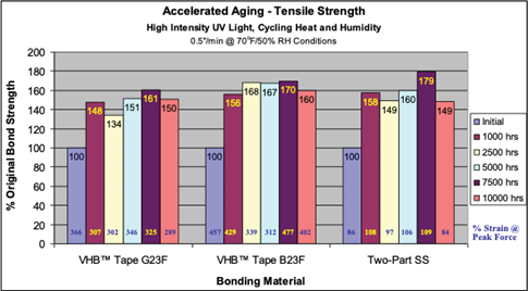 The performance of the 3M VHB Tapes was equivalent to the structural silicone sealant in this extreme accelerated aging test, which included moisture exposure and UV exposure well beyond what is required in ASTM standards for glazing sealants and demonstrates the performance of this tape for applications requiring long-term durability.