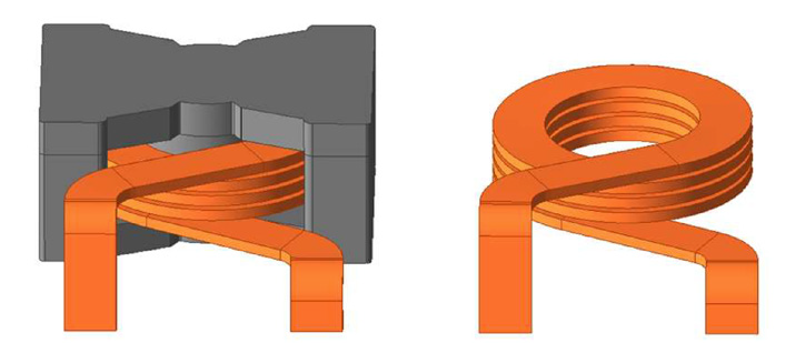 Among different solid wire types, flat spiral and helix shapes present superior performance, while they have better manufacturability in printed circuit boards (PCBs) and a reduced size of magnetic components. Spiral shapes have proximity effect issues and are more suitable for high frequency planar transformers. Solid flat wire winding presents better thermal conductivity and DCR; however, more work is needed to have accurate and simple models suitable for design optimization algorithms. Fig. 1 shows a power inductor based on a helical flat wire coil.