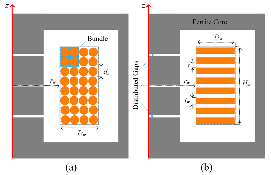 To make an optimal compromise between DCR and ESR at high frequencies, several solutions based on solid copper wire have been proposed in the literature. For example, in, a design procedure for round wire is presented with a single layer winding structure to reduce ESR for high frequencies. However, this winding structure is suitable for toroid shapes, while for the other core geometries such as a P-core geometry, the inductor will become bulky and a major part of the core’s window area remains empty. Another alternative is multi-layer foil windings; however, this wire type is suitable for medium frequency transformers with interleaved windings. For inductors and other multi-layer windings, foil wire presents higher losses due to the proximity effect between the layers.
