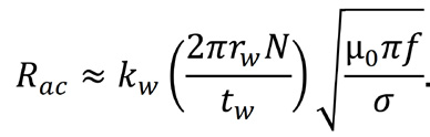 However, rings-model is affected by edge-effects of the first and last turns and the space between turns, s. Using FEM simulations, it is shown that for a specific N and tw, this model can be corrected by a fix correction factor of kw, as included in (7) and the presented formulation accurately derives Rac in a wide range of operating frequencies defined by: