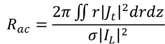 In (11), the integral is calculated on a surface area of one turn. By solving A, Rac can be achieved by calculating ohmic loss in all cylindrical coordinate and dividing the calculated loss by the squared value of the inductor current, as follows: