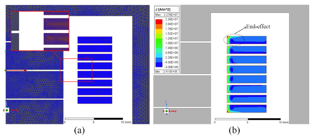 Fig. 3 shows a 2D Eddy-current FEM simulation and the mesh plot for the solid flat wire inductor model with f = 100 kHz and an AC peak current of IL = 5 A. Based on 2D eddy-current FEM simulations, the inductor value is calculated at approximately 34.8 μH. By using (12) and post-processing the magnetic vector potential, A, Rac is derived at approximately 33.3 mΩ. As seen in Fig. 3(b), except for the edge effects, the current mainly passes through rings.