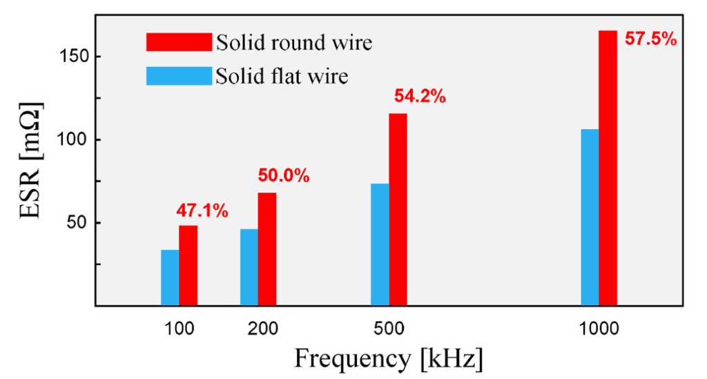 Fig. 4 compares the ESR of the two designs for different frequencies up to 1 MHz and shows that the solid flat wire is significantly better, especially at higher frequencies, while the proximity effect between the two layers of the round wire design increases significantly. It is worth noting that for solid wire design with fewer parallel branches, m < 4, the ESR will be even higher which confirms the superiority of solid flat wire.