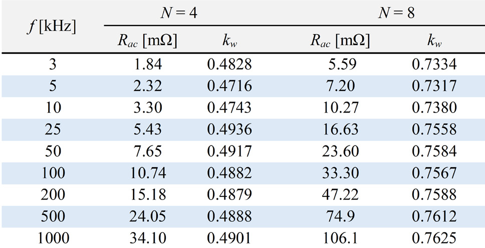 To show the proposed assumptions described in (7), FEM simulations under different operating frequencies are done for two inductors manufactured with solid flat wires. Table 1 presents the calculated Rac for the two inductors with N = 4 and 8, and similar tw = 1.178 mm and s = 0.322 mm. Using (8), fmin is calculated at approximately 3 kHz, hence Table 1 presents the results for frequencies from 3 kHz up to 1 MHz. To calculate kw, first, Rac is calculated by (12) using FEM simulations. Then, using (7), the physical parameters of the winding and the known Rac, kw can be calculated for each FEM simulation, as included in Table 1.