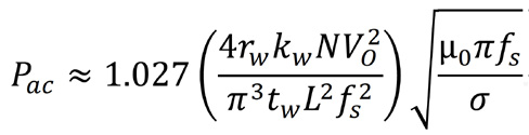 To calculate ESR, Rac, under sinusoidal alternating currents (AC), several analytical solutions have been developed in literature. However, they are mainly developed for solid round wire. For rectangular conductors, recent analytical formulations are developed only for a single solid flat wire in 2D x-y plane. Furthermore, according to the analytical solutions, the formulas are accurate when the thickness of the conductor is less than double the skin depth, δ, which is defined by (6).