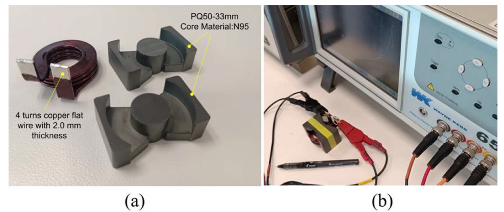 To verify the analytical formulations, a 5.6 μH, 80 A power inductor is implemented with N = 4, tw = 2.0 mm, Dw = 9.5 mm, s ≈ 0.6 mm and rw = 11.0 mm, as shown in Fig. 5(a).