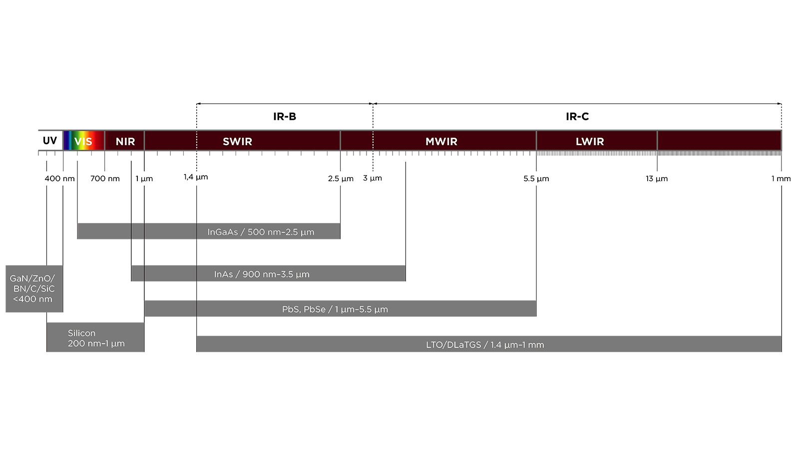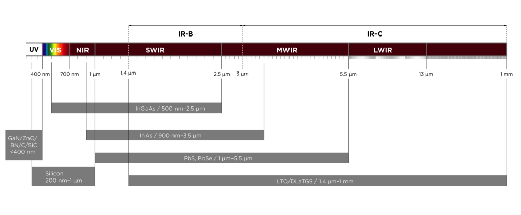 - Spectral range and materials: Spectral range is the range of wavelengths over which the photodetector is sensitive, typically measured in nanometers (nm). The below image shows some of the photodetector materials that are used to detect signals ranging from UV wavelengths to Long Wave Infrared (LWIR) wavelengths. With the longstanding evolution of photodetector technologies, many materials for components currently in use may be outdated compared to new advancements. Development of compounds like Silicon carbide (SiC), Gallium nitride (GaN), indium gallium arsenide (InGaAs), and other semiconductor materials like InGaAsSb have enhanced photodetectors’ sensitivity and spectral range. These materials detect short-wave infrared (SWIR) and middle-wave infrared (MWIR), increasing their versatility. Organic, graphene-based and flexible photodetectors expand possibilities for wearable technology and biomedical applications.