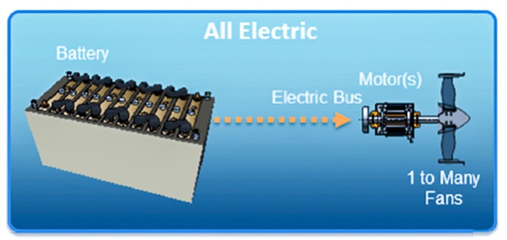 In a parallel hybrid system, an electric motor and a fuel-burning engine are connected to a common shaft that drives a fan, so one or both can provide propulsion at any given time. In a series hybrid system, only the electric motors are connected directly to the fans, and the fuel-burning engine drives a generator, which in turn drives the motors or charges the batteries.