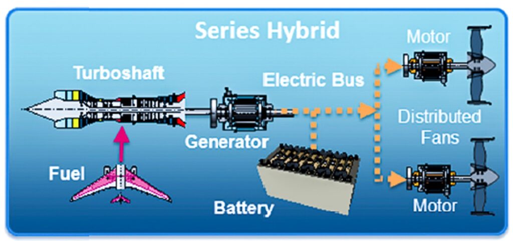 In addition to parallel and series systems, combined series-parallel partial hybrid systems have also been developed. With this approach, one or more fans can be driven by a gas turbine engine, and additional fans are driven by electric motors powered by a battery or a turbine-driven generator.