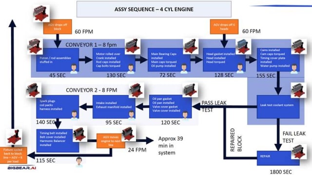Engine parts modeled with Inventor are to be assembled in a plant that operates on a schedule that has two shifts a day with assemblers making $28 per hour. When the line is operating at 70 percent capacity, it produces 425 engines per shift. When at maximum capacity, 450 engines are produced per shift. With as many as 15 steps in the sequence (depending on whether they pass or fail a leak test), the average process time is about 39 minutes. By experimenting with the layout and making changes to the machines in stations, Jolicoeur shows how 12 more engines can be produced per shift. If each engine generates a profit of $984, the extra engines will return the cost of the changes in 20 days.